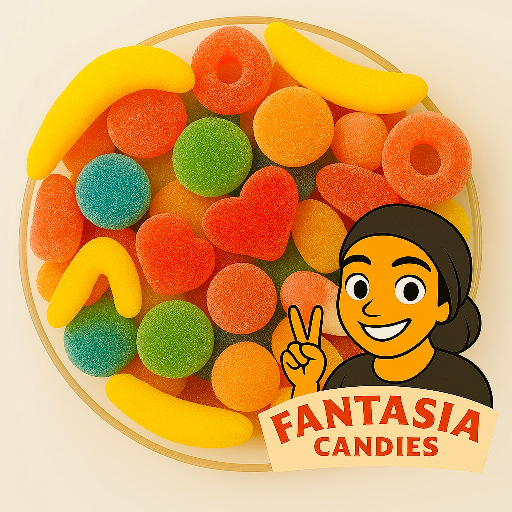 Assortiments de délicieux bonbons sucrés, ( cœur pêche, anneau fraise, bisou fraise, bananes et..) 1KG