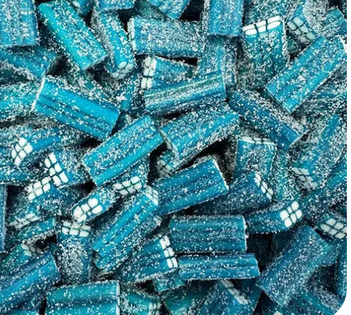 INGREDIENTS : Sirop de glucose-fructose, sucre, amidon, farine de blé* (gluten), sirop de sucre inverti, eau, acidifiants (E330, E296), amidon de pomme de terre, maltodextrine, humectant (E422), correcteur d'acidité (E332), graisse végétale (palme), gélatine de bœuf halal, arôme artificiel, colorants (E133), agents d'enrobage (monostéarate de glycérol (tournesol, E471)), huile végétale (coco, karité), émulsifiant (E322)
