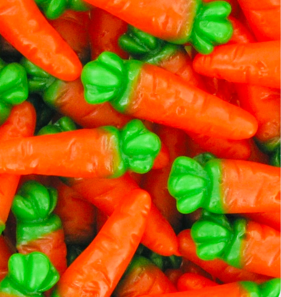 Délicieux bonbons gélifiés lisses en forme de carottes, au goût fruité (orange).