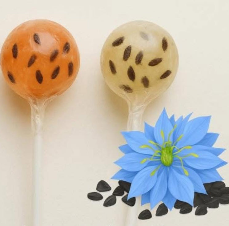 Délicieuses sucettes goût pomme, fraise, cassis ou orange, avec de vraies graines de nigelles à l’intérieur! Incroyablement bon 😍
